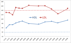 LDLは糖尿病発覚時には130で基準内130でしたが、そのごじりじりと上がって160程度をピークに横ばいか、少し減少傾向、但し基準値オーバーです。