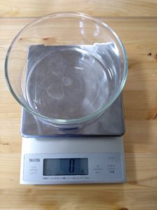 画像が見にくいかもしれませんが、一番右を押すと、はかりのにものが載っている状態で0gと表示されます。ので、このはかりの上で数字をみながら材料を入れればよいので、計量スプーンとか計量カップが不要です。(水も油も1cc=1gとアバウトな換算をするからですが)