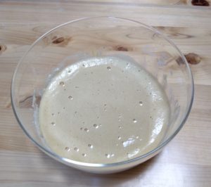 容器に材料の粉物(おからパウダーと、必要に応じで、味付け用のココア、シナモン、エリスリトールなど)を入れて、次に液体(水または豆乳・牛乳、卵、油)をいれて混ぜる(お箸などでかき混ぜるだけです)