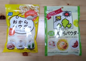 右の「キッコーマン」は粉が細かく、おから餅に適しています。