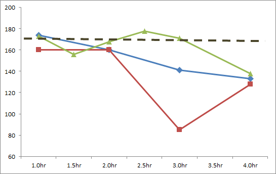 食後2時間から2.5時間までは、概ねこの170のライン前後で推移しているように見えます。