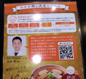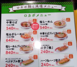 このメニューには、中華そば、塩ラーメン、塩ネギラーメン、など5種類が掲載されていますが、メニューにあるどのラーメンでも+100円でロカボ麺に変更できるとのこと