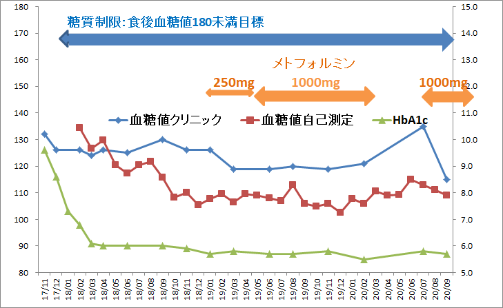 メトホルミンの服用後は起床時血糖値が100~110の範囲におさまることが多くなり、約1年後にはHBA1cが5.5まで下がったことから、メトホルミンの服用を休止しました。(2020.2月)
