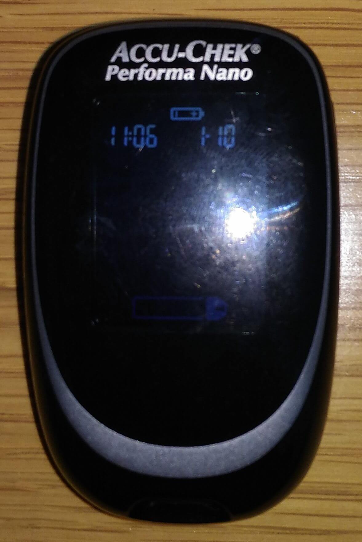 見づらいかと思いますが、表示画面の一番上、機種名accu chek performa nanoの下、日付と時間の表示の上にあるのが、電池マークの表示です。
