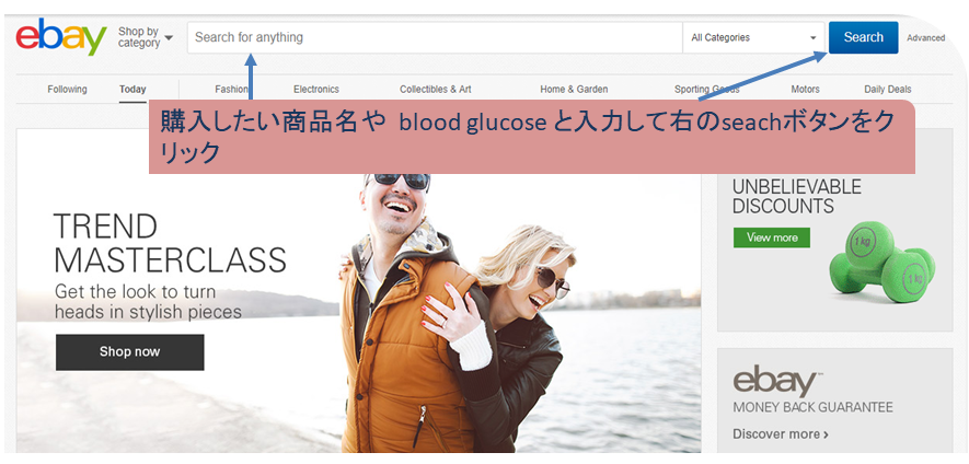 まずebayホームページで、検索します。製品名でもよいですし、blood glucose で検索するといろいろな商品が出てきます。
