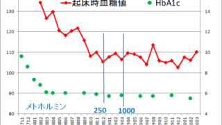 日々メトホルミンの血糖値上昇抑制効果-その2 前の記事で、私のデータからはメトホルミンの血糖値抑制効果が10程度と想定されることを書きました。これは、 ・メトホルミン休止前と休止後の起床時血糖値の変化(休止前後一か月) ・朝食後の血糖値上昇 ・HbA1cの変化(メトホルミン使... 2020.04.03日々