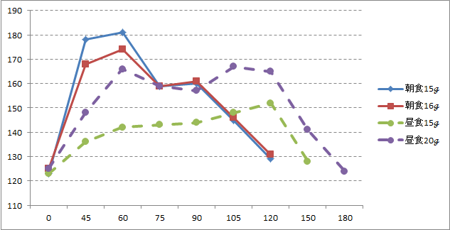 昼食後は概ね糖質量の差5g分の差と考えてよいように思います。