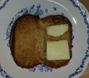 家で主食としてブランパンを食べるときはパン切ナイフで開いてオーブントースターで焼いてからバターをのせて食べています。これは代替食品というレベルではなくて十分おいしいと思います。こんな感じです。バターの場合は食べるときはパンは開いたままでなく、元の形に戻して食べています。簡単なのでおすすめです。