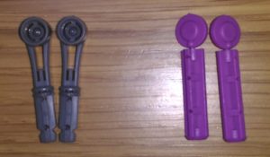 ついでに、穿刺器で使用するランセットも専用品でした。写真の右がcontour next EZ やOn Call Expressのキットの穿刺器で使うランセットで、多くの機種はこの形のものが共通に使われているようです。ランセットわざわざランセットだけ追加で買うのも面倒でかつ付加価値はないので、穿刺器とランセットはOn Call Express付属のものを使っています。