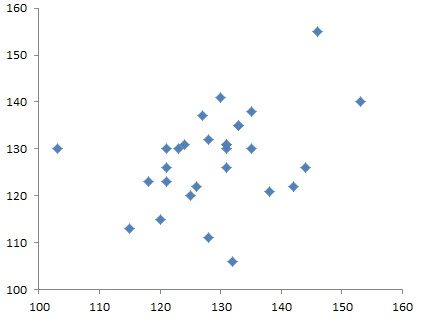 中央に数字が集中する傾向がある(血糖値はおおむね一定である)ので、相関係数はあまり高くならないくはならない、t検定の結果も統計的に有意であるとはならないだろうと思っていましたが、この数値なら相関はある(結構強い)といってよいように思います。